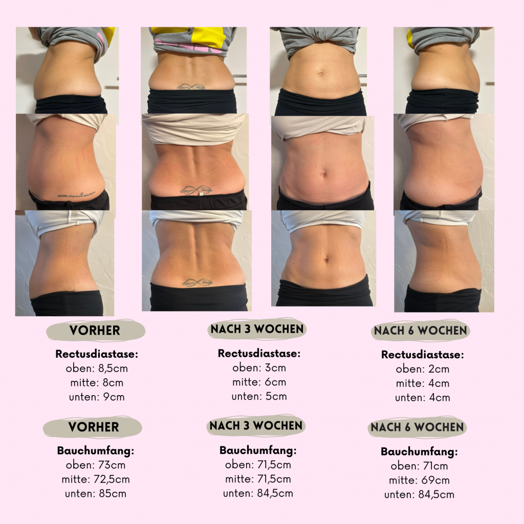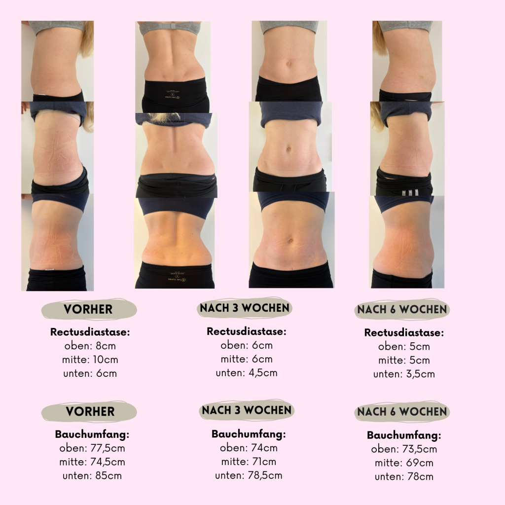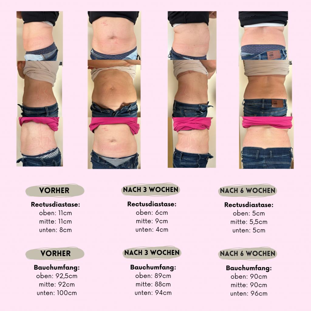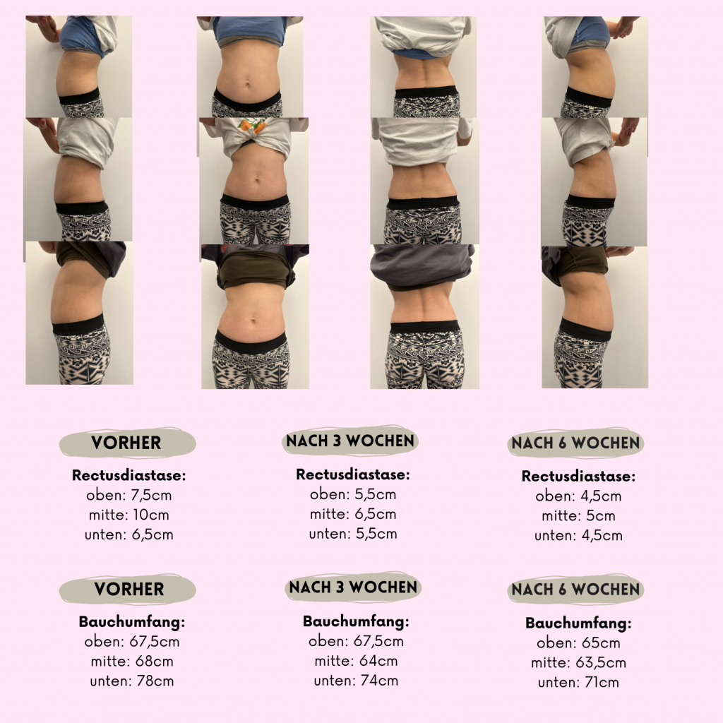 Es werden beim ersten Termin Vorher/Nachher Fotos und Maße genommen, das korrekte Anlegen des Diastasis Rehab Splint® gezeigt, die 4 Schritte der Tupler Technique® besprochen und die Anpassung von Alltagsbewegungen erklärt.
